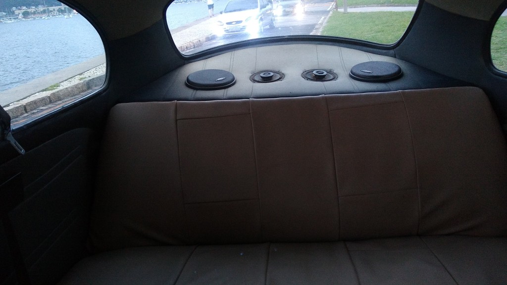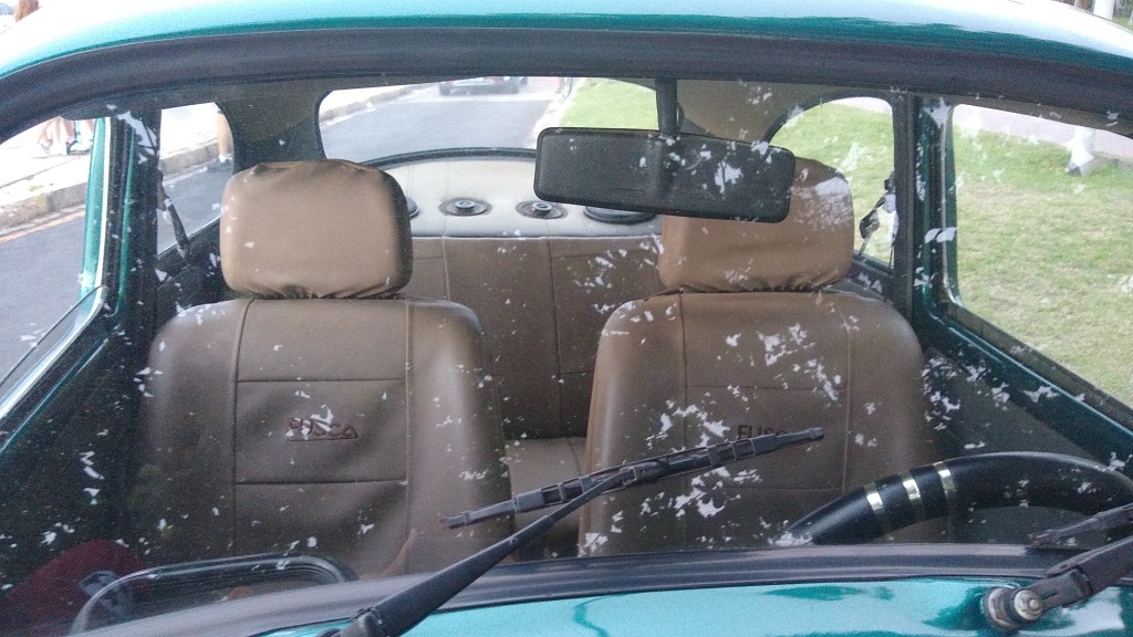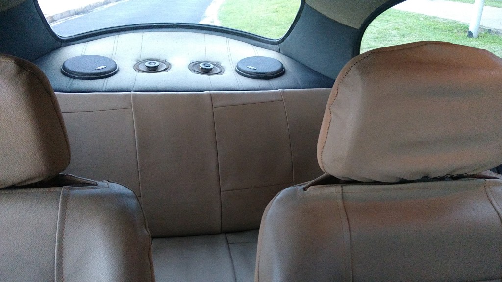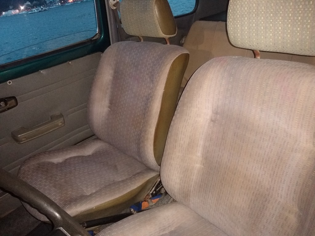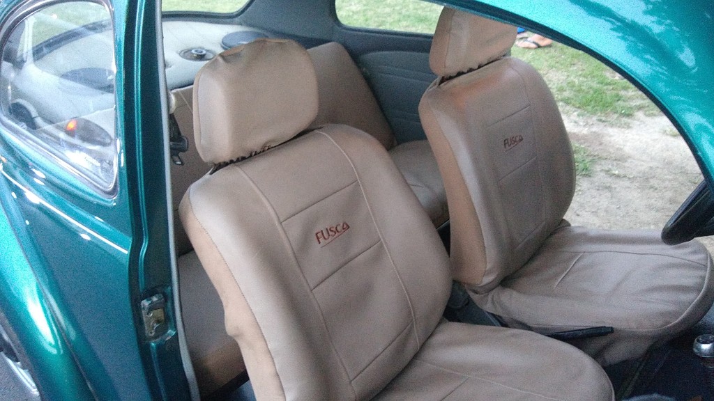 Bancos originais e com capas protetoras em couro bege.